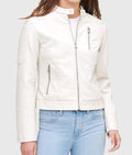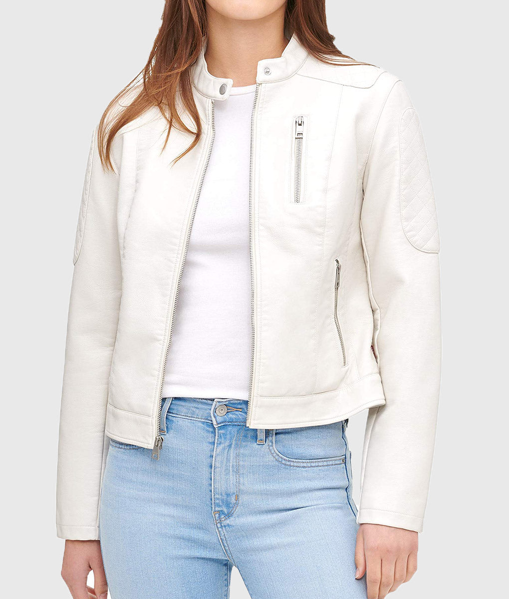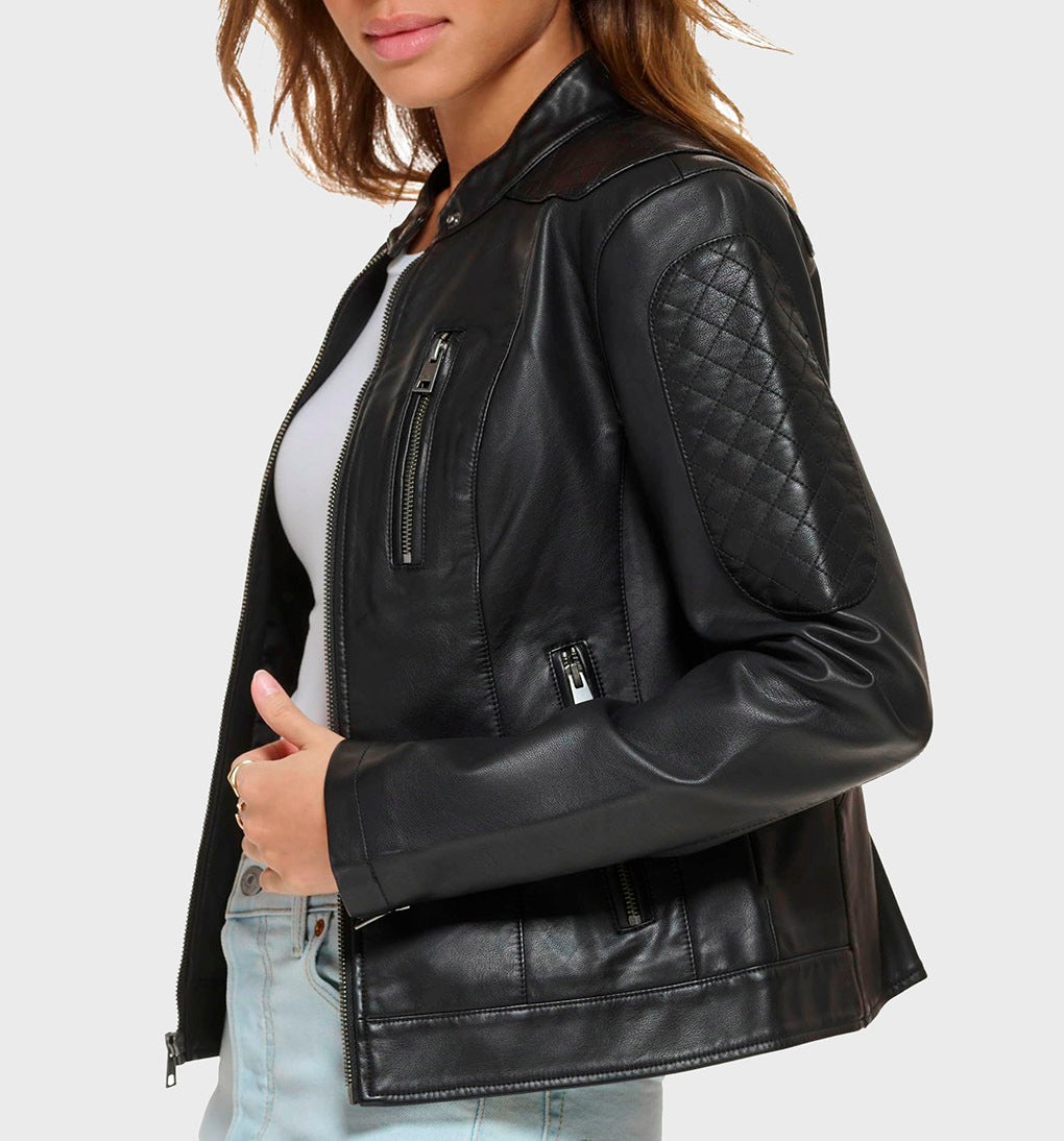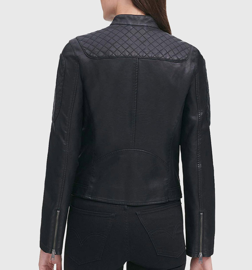 Women Genuine Leather Jacket, Quilted Moto Cafe Racer Female Leather Jacket, Stand UP Collar Jacket