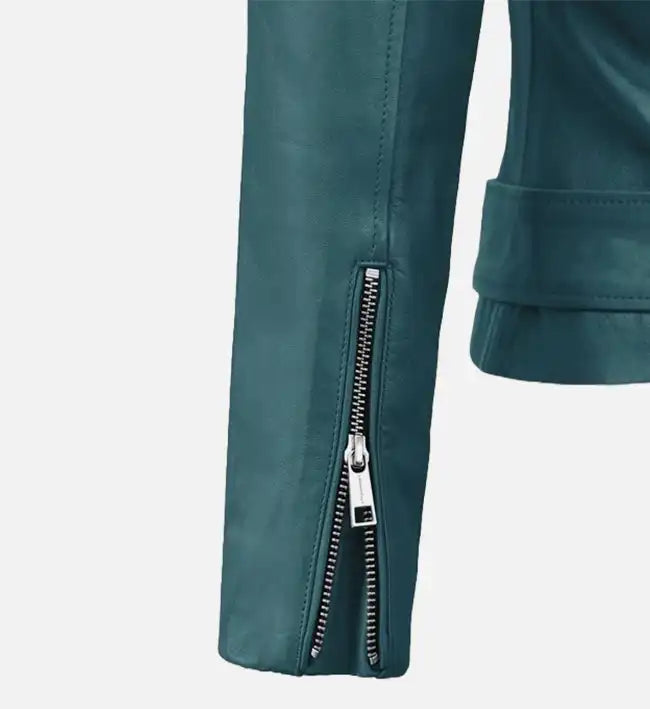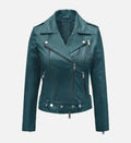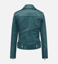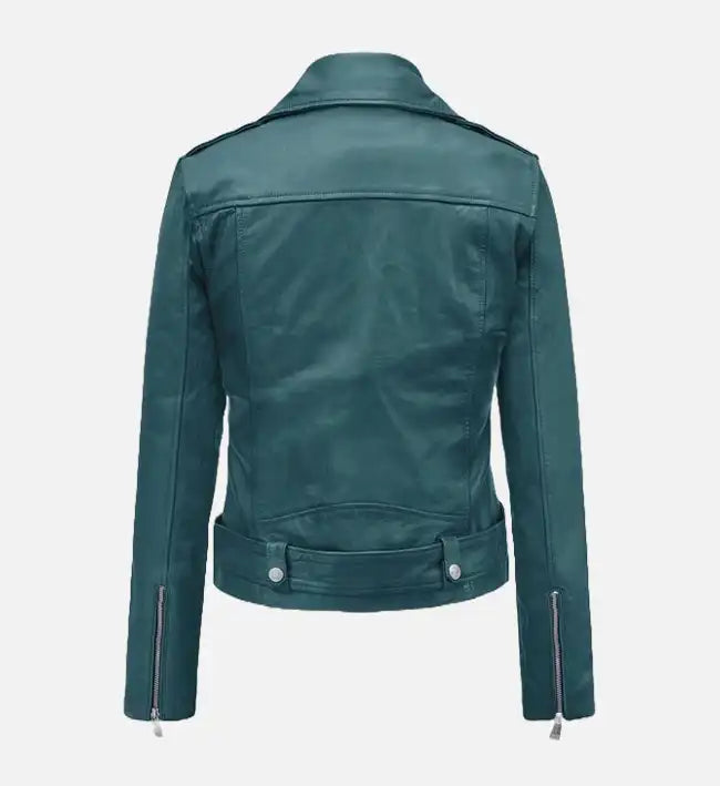 Turn heads with this bold and timeless women’s biker leather jacket, crafted from 100% genuine sheepskin leather for a luxuriously soft feel and lasting durability. Designed in an elegant Prussian Blue shade, this jacket blends classic biker attitude with refined tailoring, making it a standout addition to any modern wardrobe.