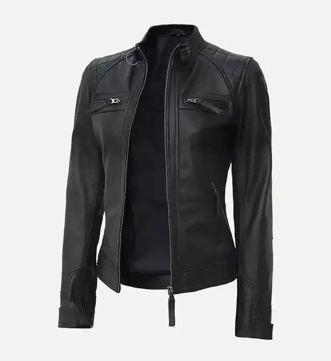 Elevate your wardrobe with this chic women’s leather jacket, crafted from 100% genuine sheepskin leather for a soft, supple feel and long-lasting durability. Featuring a statement café racer design, the tan brown finish is complemented by quilted shoulders, a slim-fit silhouette, and strap detailing at the waist, creating a bold yet elegant look perfect for everyday wear or evening outings.