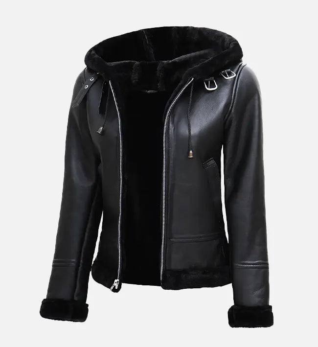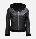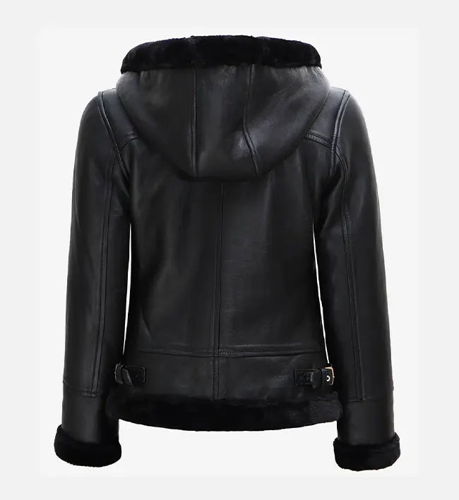 Women’s Sheepskin Leather Aviator Jacket – Black with Fur-Lined Hood