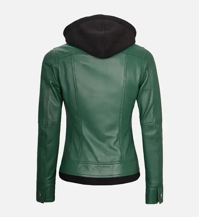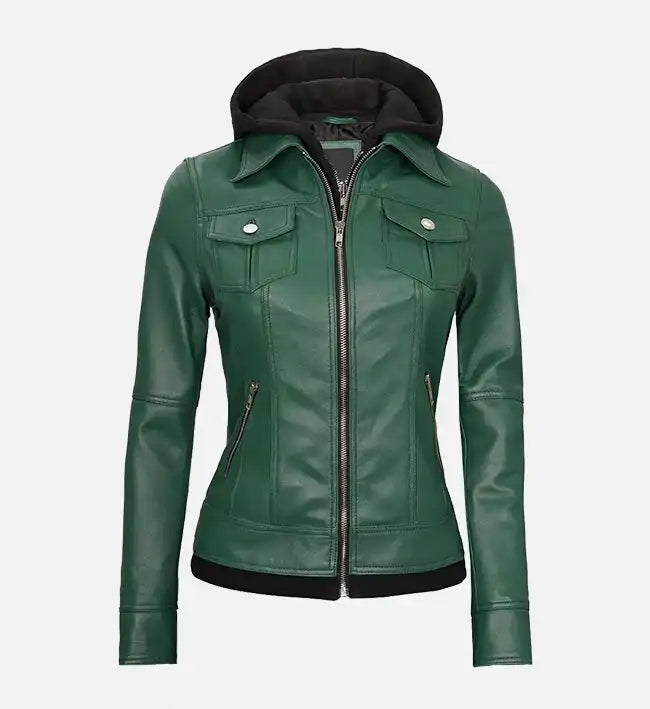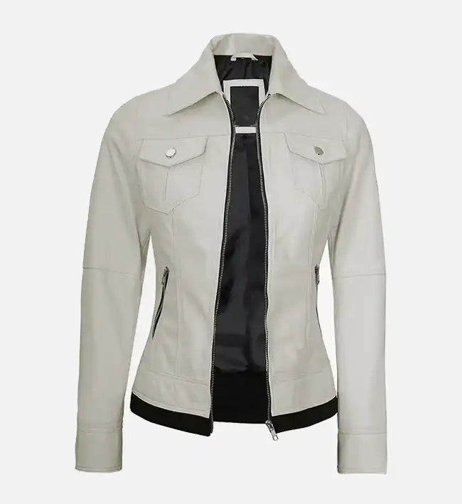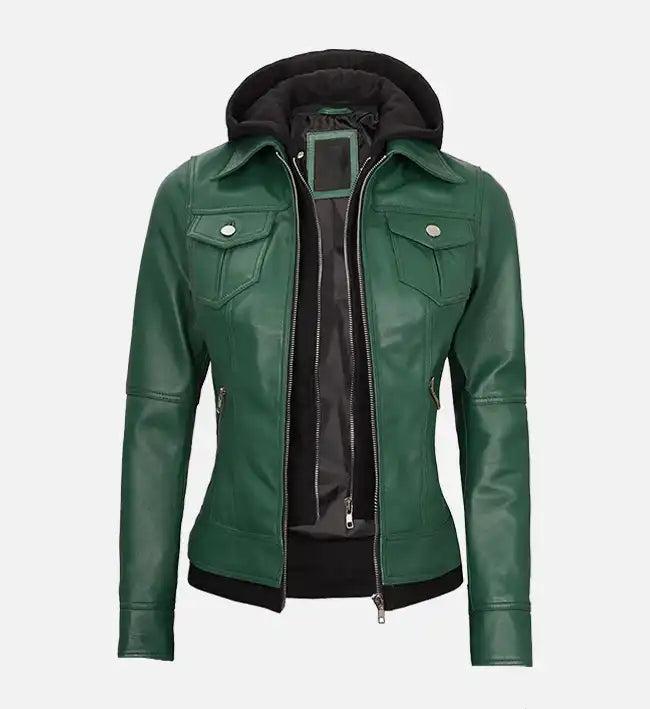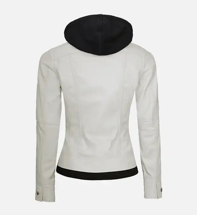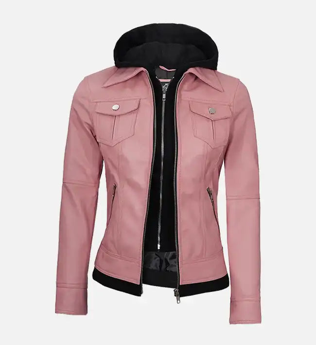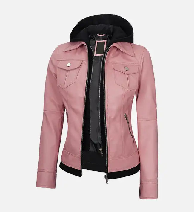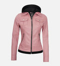 Elevate your style with this chic women’s leather jacket, crafted from 100% genuine sheepskin leather for a soft, supple feel and long-lasting quality. The multi-color palette of off-white, pink, and green, combined with a sleek, minimalist design and a removable hood, offers a versatile and contemporary look perfect for casual outings or statement layering.