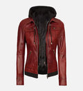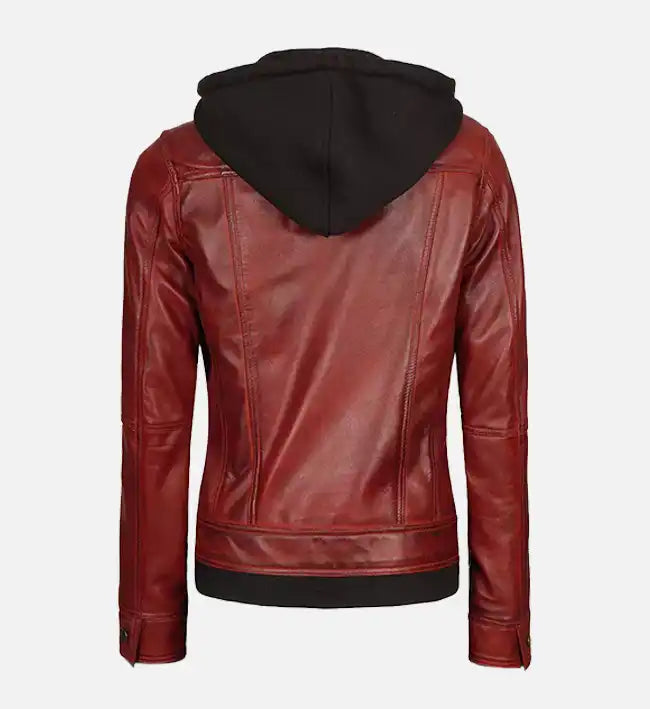 Women’s Sheepskin Leather Jacket – Red with Removable Hood and Contrast Waistline