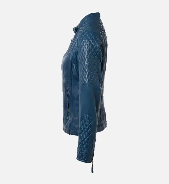 Elevate your wardrobe with this stylish women’s leather jacket, crafted from 100% genuine sheepskin leather for a soft, supple feel and premium durability. Available in Black, Blue, and Sand, this jacket features quilted patterns on the shoulders and sleeves, a sleek silhouette, and buttoned straps at the waistline, combining sophistication with contemporary design for a standout look.